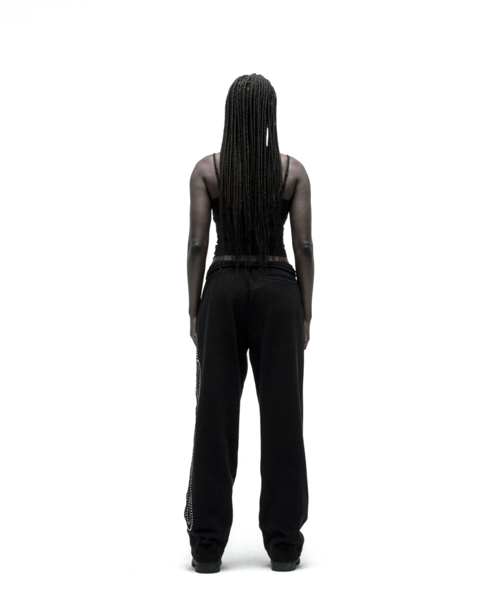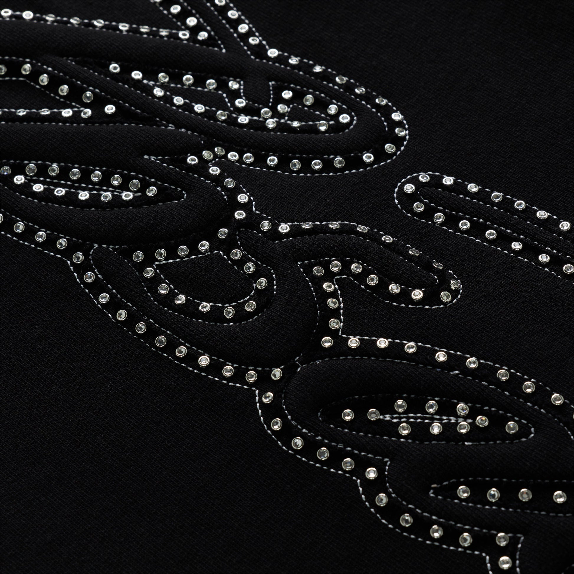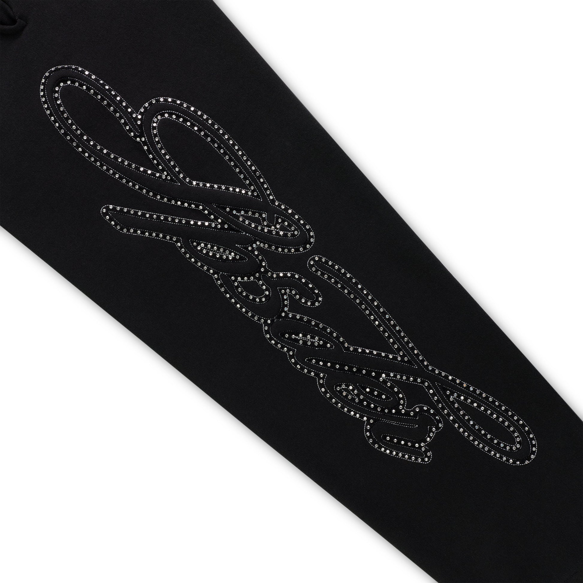 Script text design lined with rhinestones down leg.