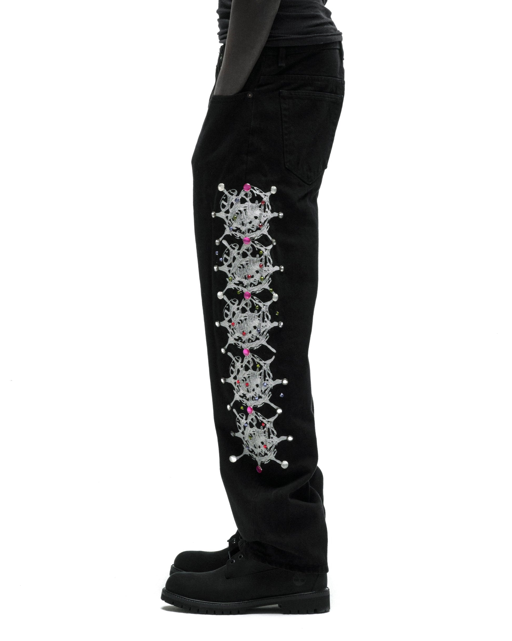 Web print design and rhinestone embellishment down both legs.