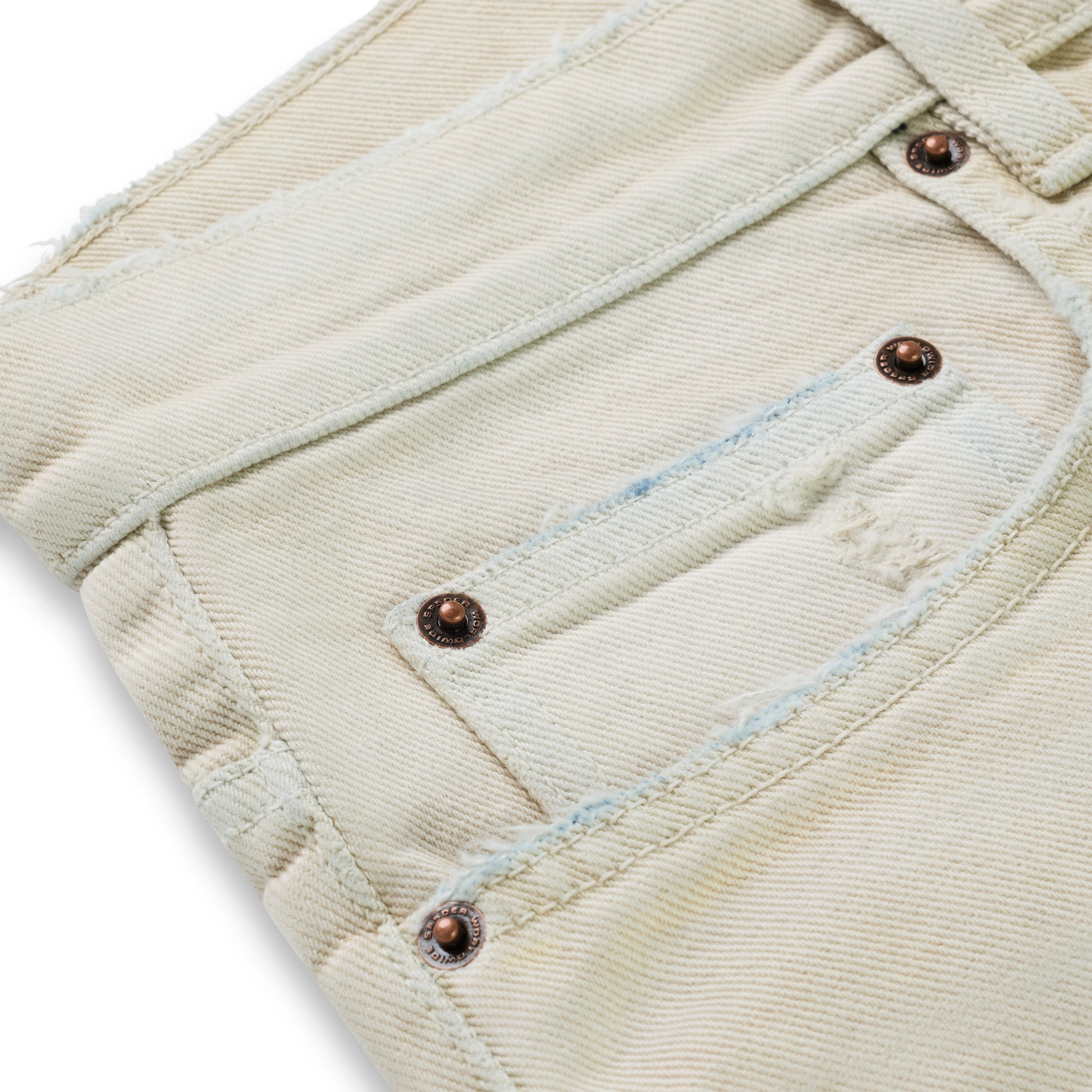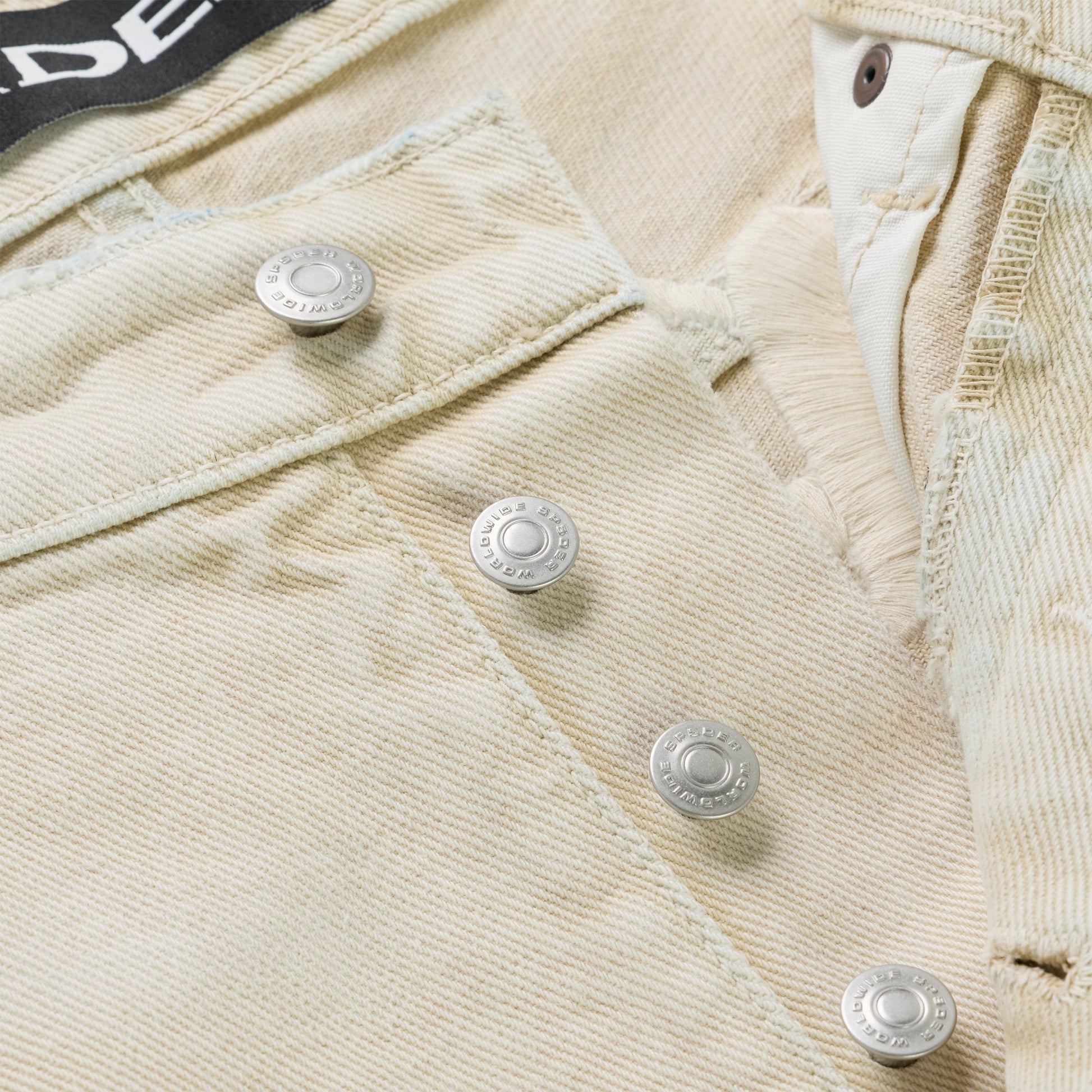 Embroidered text design above back pockets.